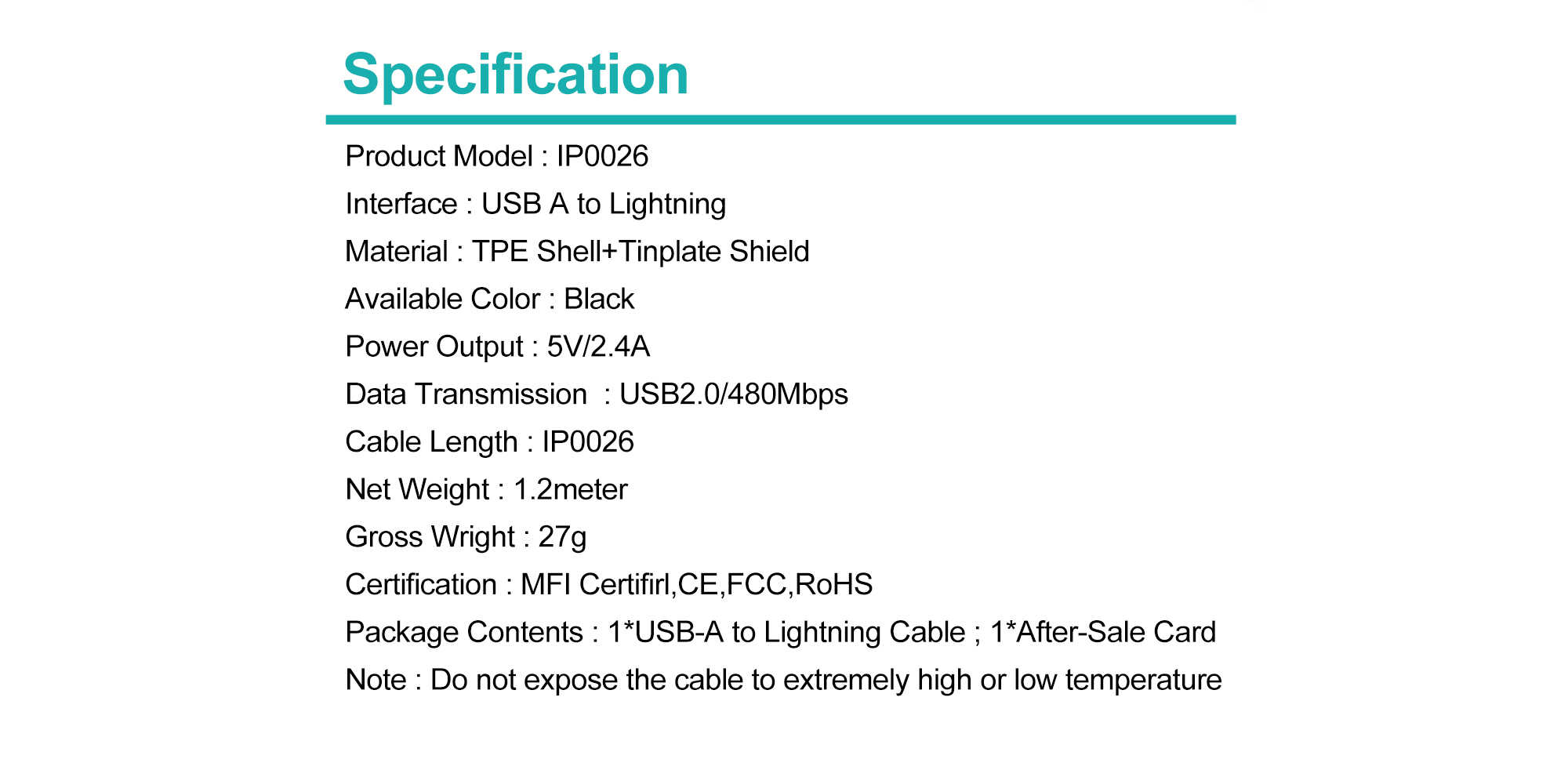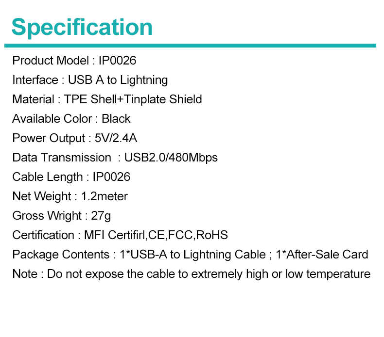 Package Contents : 1*USB-A to Lightning Cable; 1*After-Sale Card