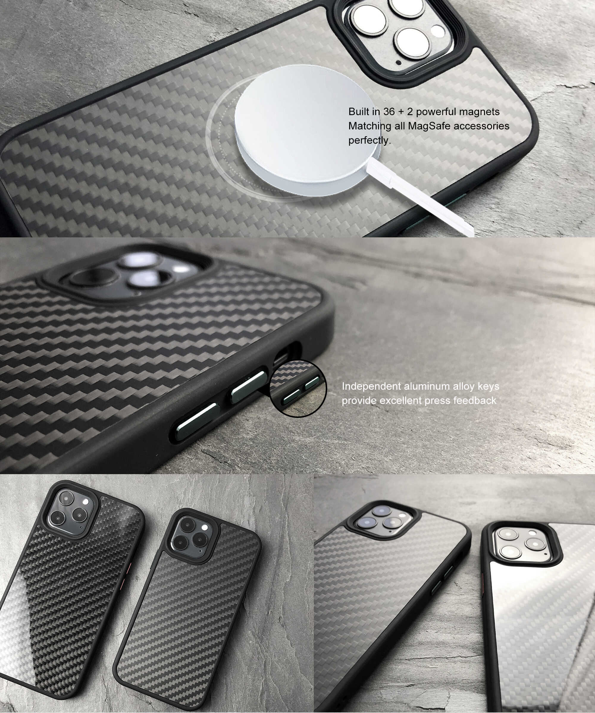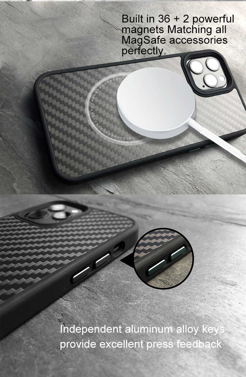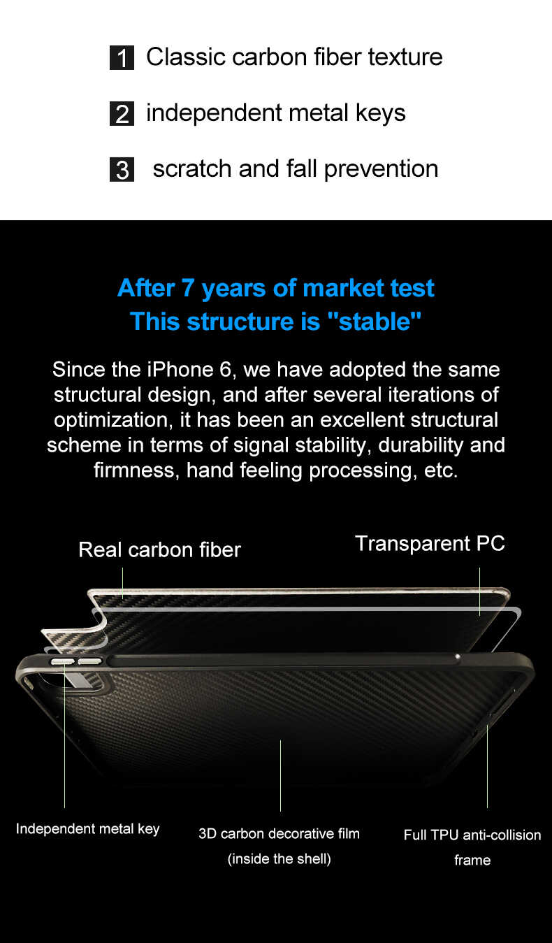 Conventional carbon fibre phone cases or Kevlar phone cases are unable to provide strong shock protection and can affect signal quality, making them less than ideal designs. We wanted to provide customers with a classic carbon fibre element that could perfectly protect the iPhone and have excellent signal performance. The case combines the classic texture of carbon fibre with powerful protection for the iPhone. The back is designed with a combination of carbon fibre and PC to ensure signal integrity. Additionally, the case is finely crafted to provide a comfortable grip, with aluminium alloy buttons offering excellent tactile feedback and exquisite button design.
