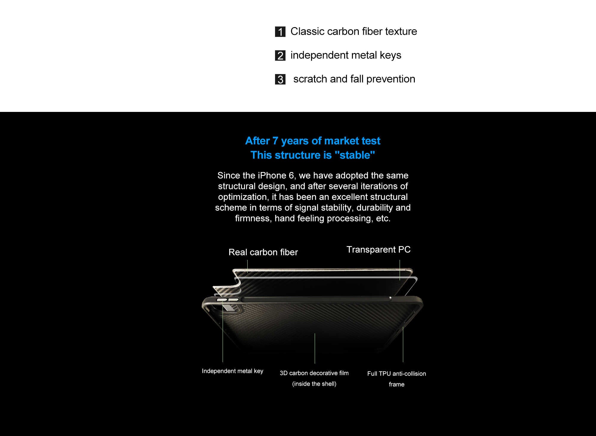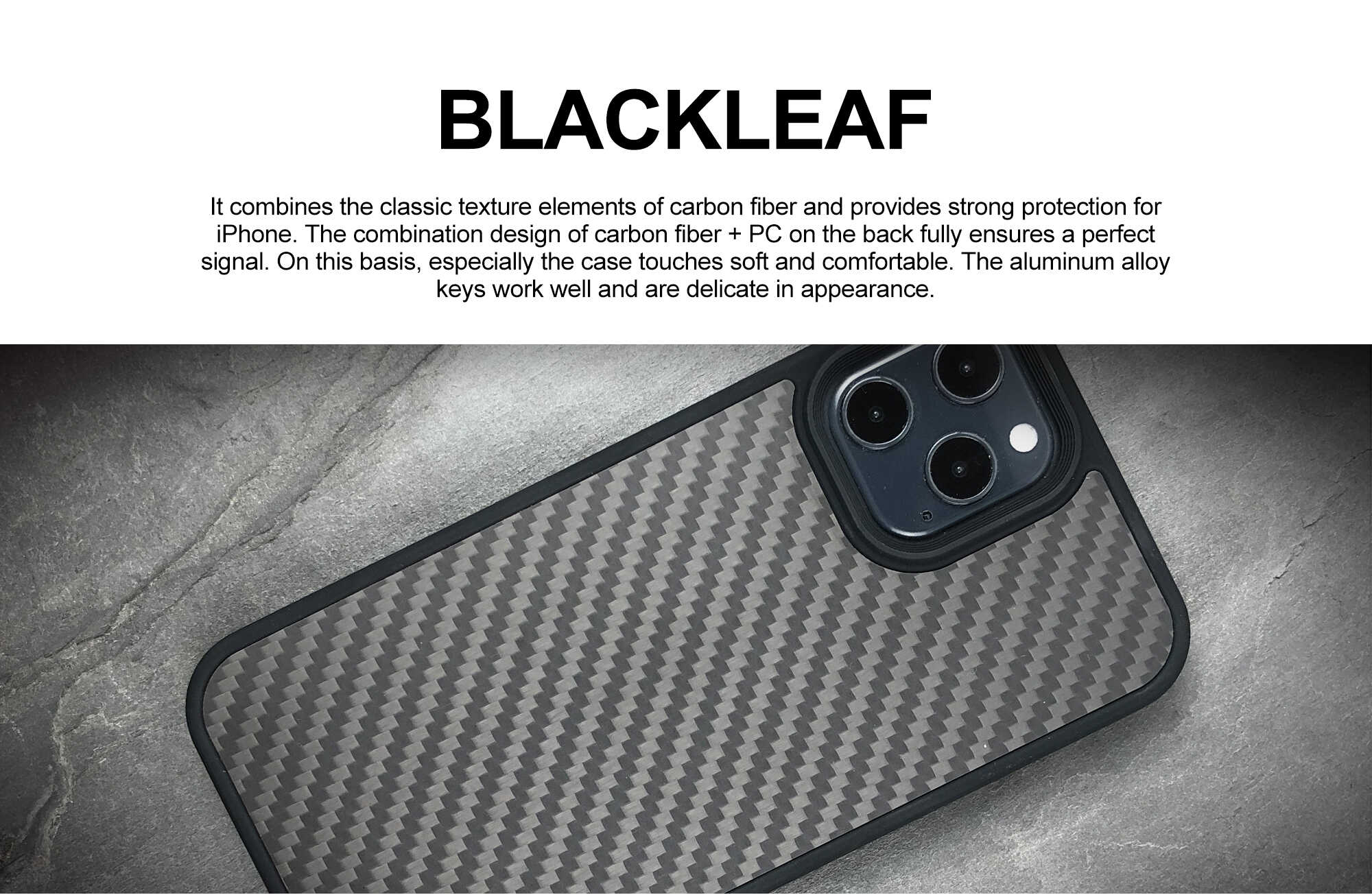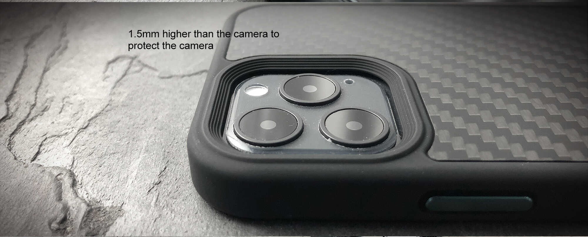 Conventional carbon fibre phone cases or Kevlar phone cases are unable to provide strong shock protection and can affect signal quality, making them less than ideal designs. We wanted to provide customers with a classic carbon fibre element that could perfectly protect the iPhone and have excellent signal performance. The case combines the classic texture of carbon fibre with powerful protection for the iPhone. The back is designed with a combination of carbon fibre and PC to ensure signal integrity. Additionally, the case is finely crafted to provide a comfortable grip, with aluminium alloy buttons offering excellent tactile feedback and exquisite button design.
