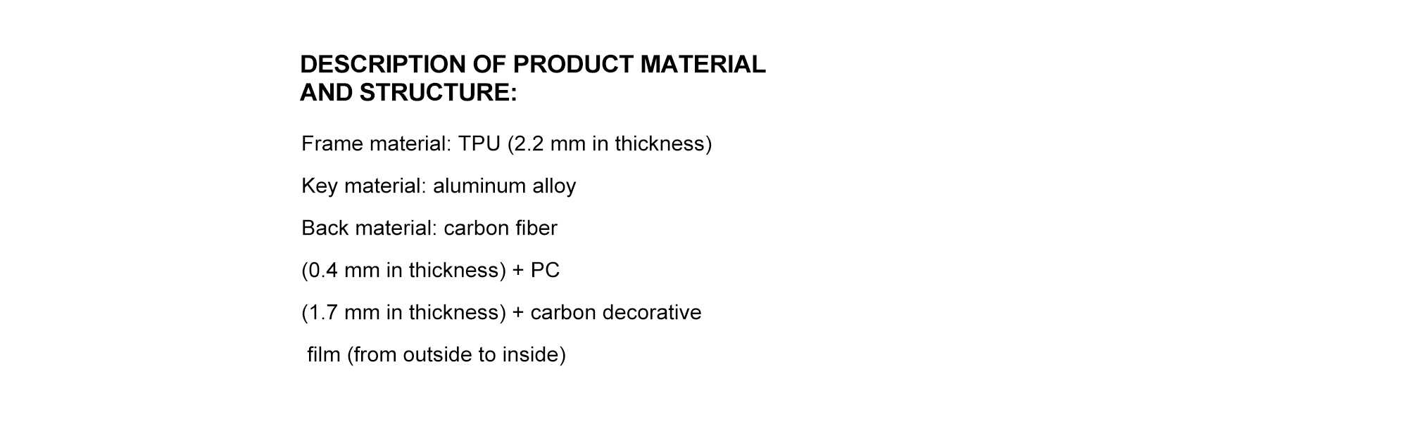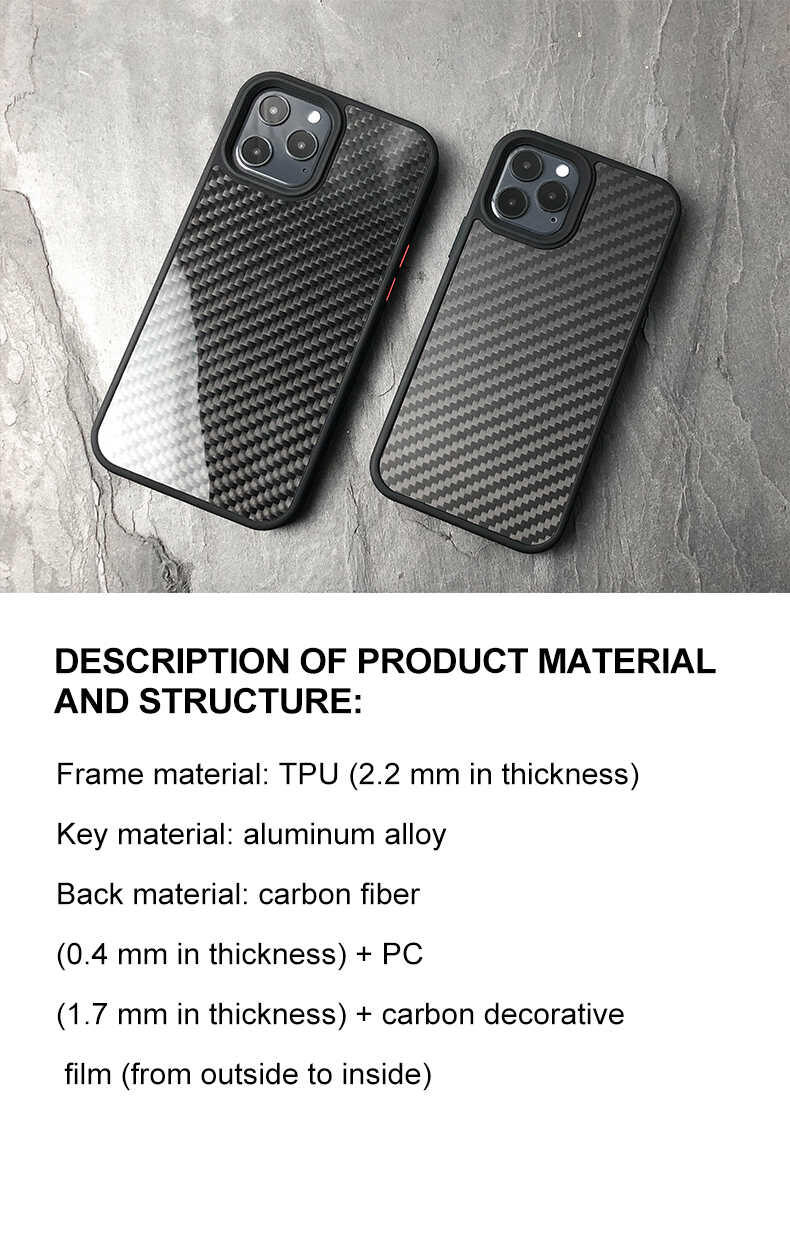 Back Material: Carbon fibre (thickness 0.4mm) + PC (thickness 1.7mm) + Carbon fibre decorative film (from outside to inside)