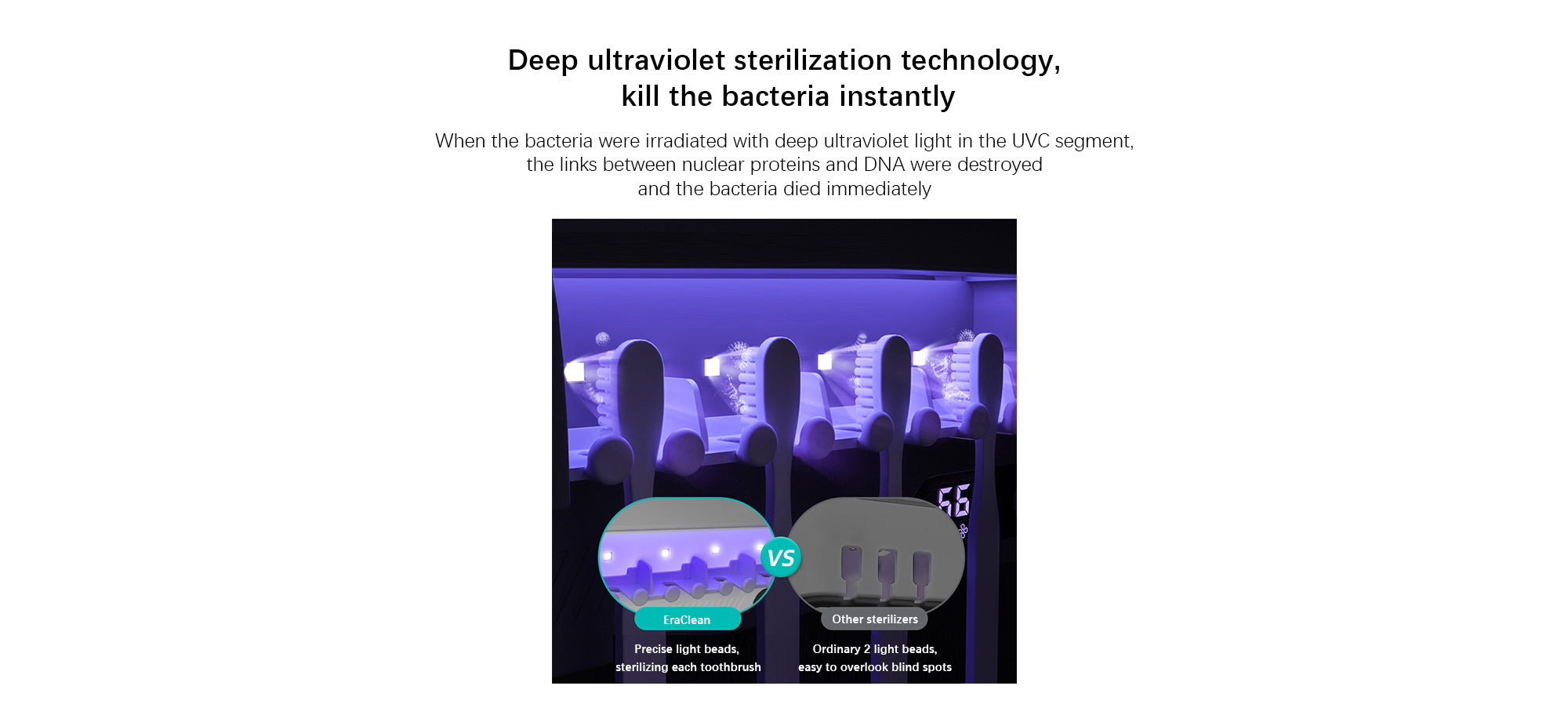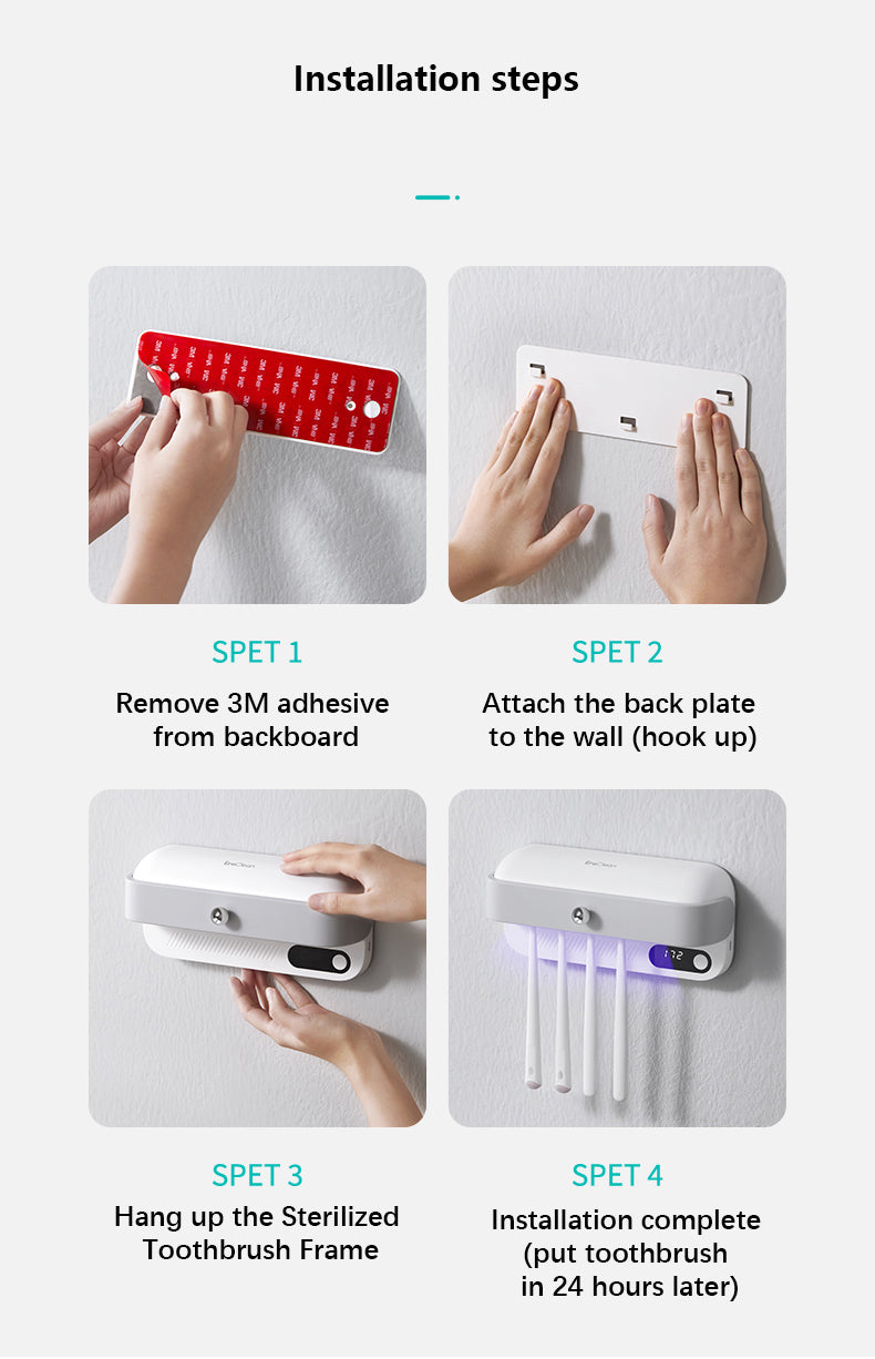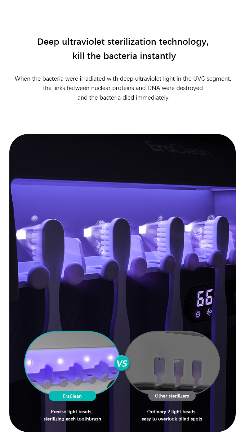 Introducing our Sterilized Toothbrush Frame, the perfect solution for keeping your toothbrushes clean and germ-free. With its innovative deep ultraviolet sterilization technology, this toothbrush holder kills bacteria instantly, ensuring that you and your family always have a clean toothbrush to use.
