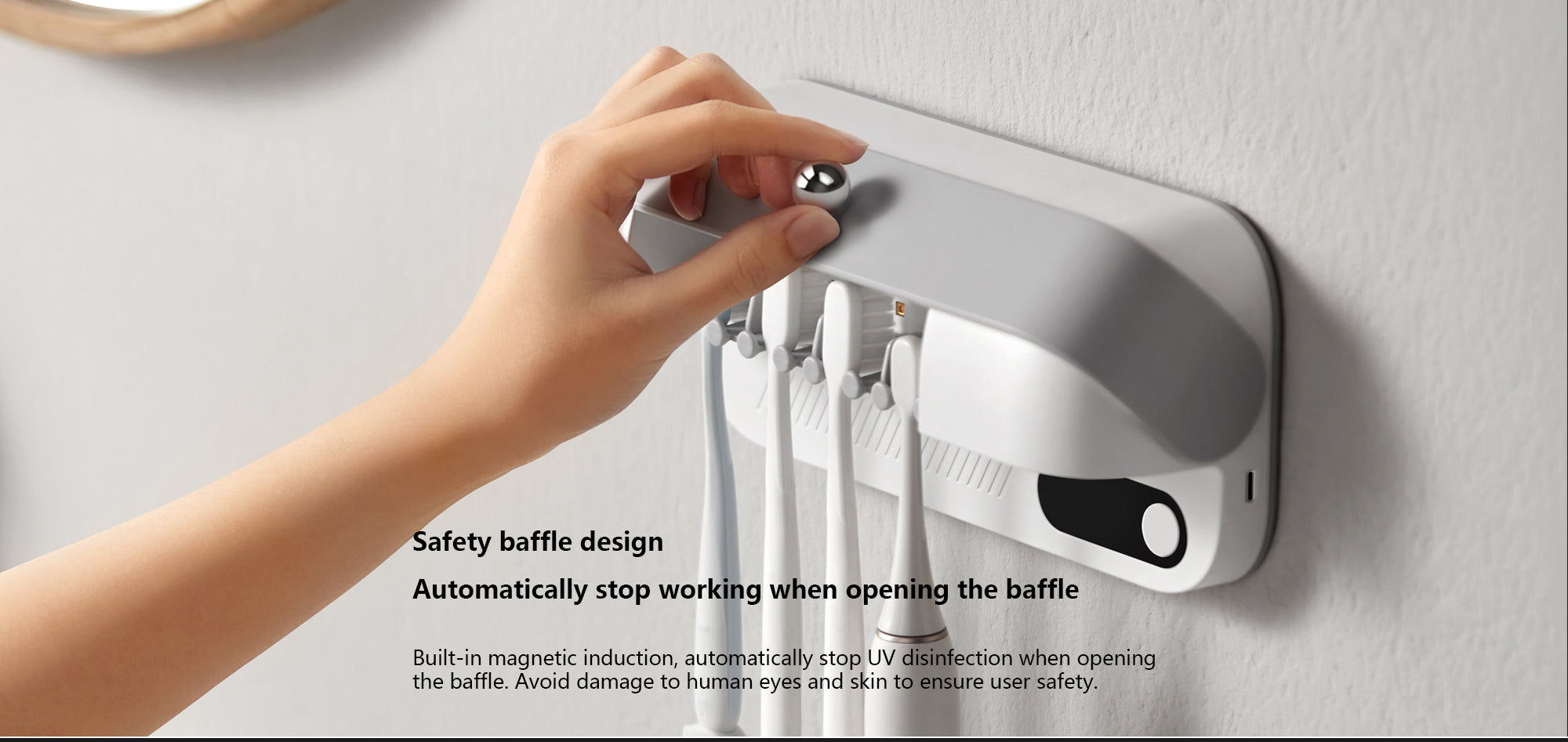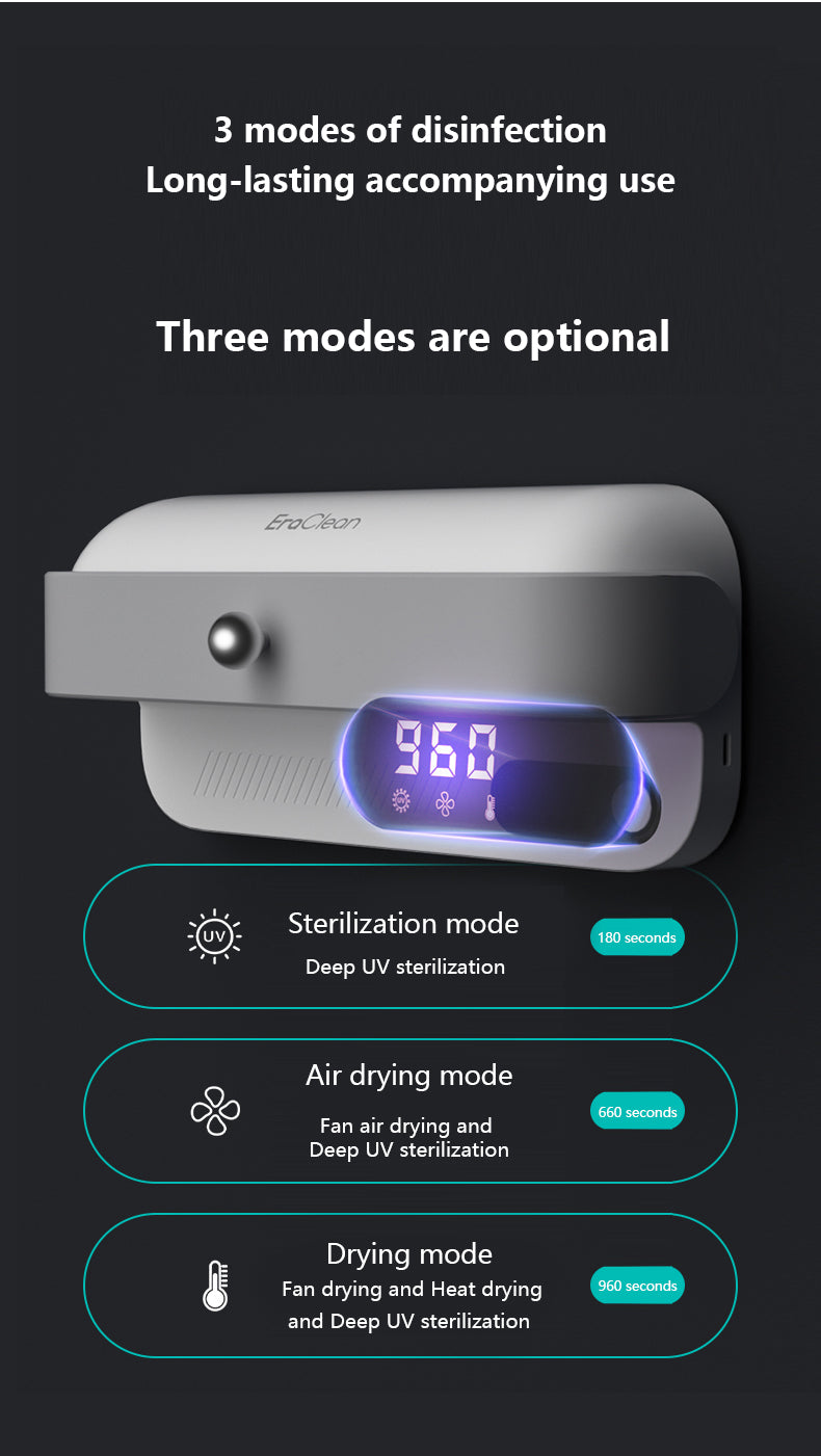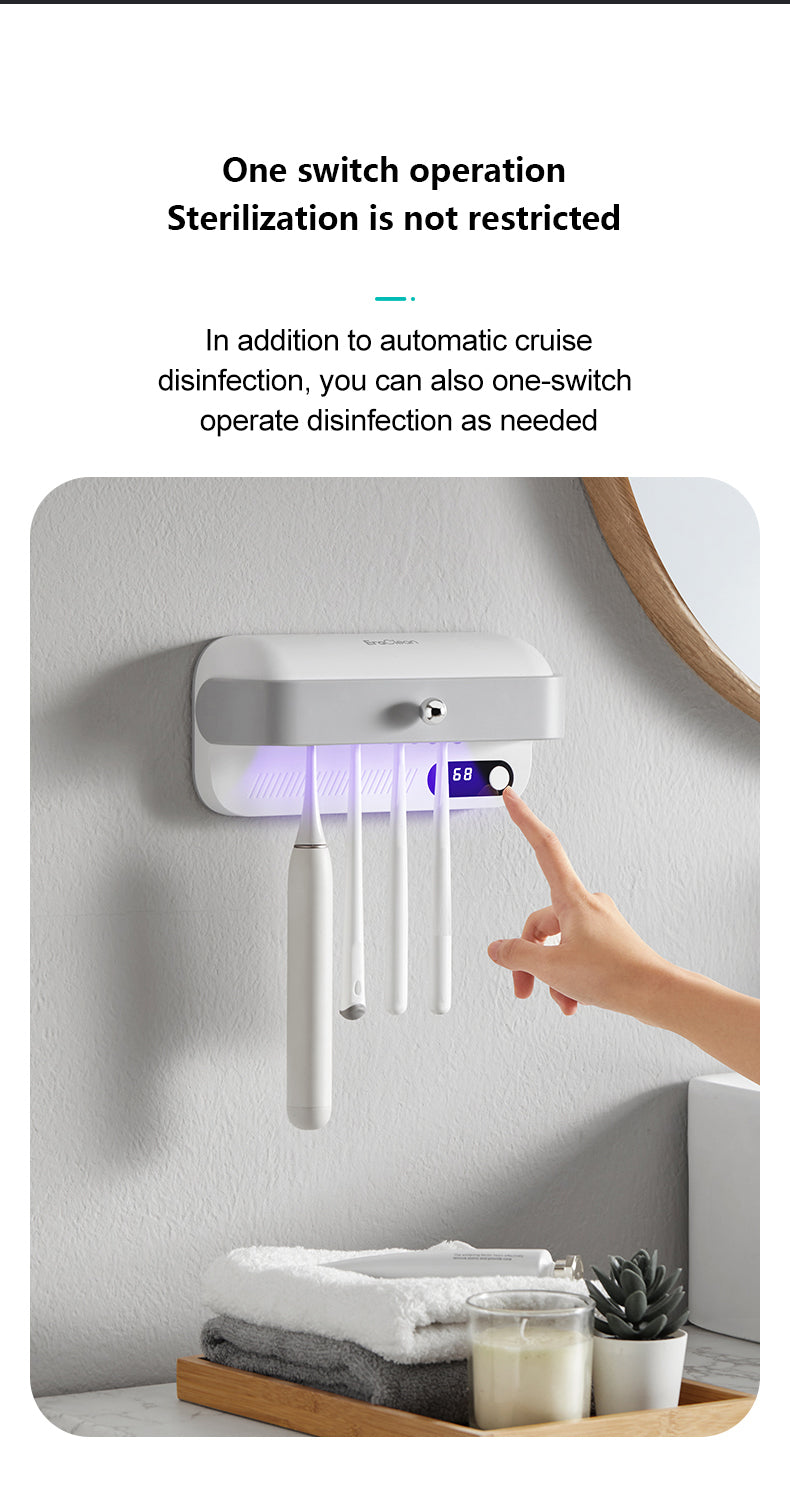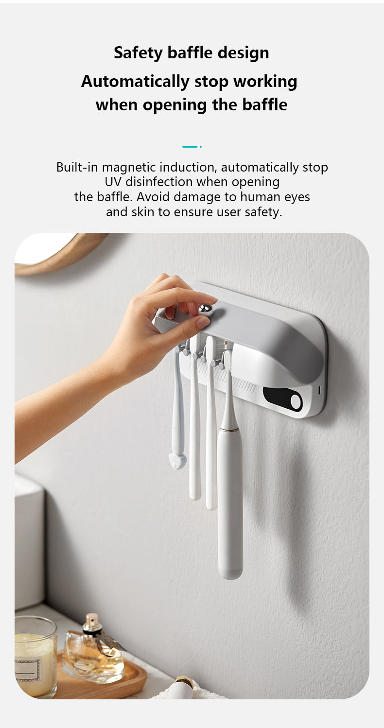 - This toothbrush holder also comes with 3 modes of disinfection, ensuring long-lasting use. It has a simple one-switch operation, making it easy to use without any restrictions. The safety baffle design also automatically stops the device from working when the baffle is opened.