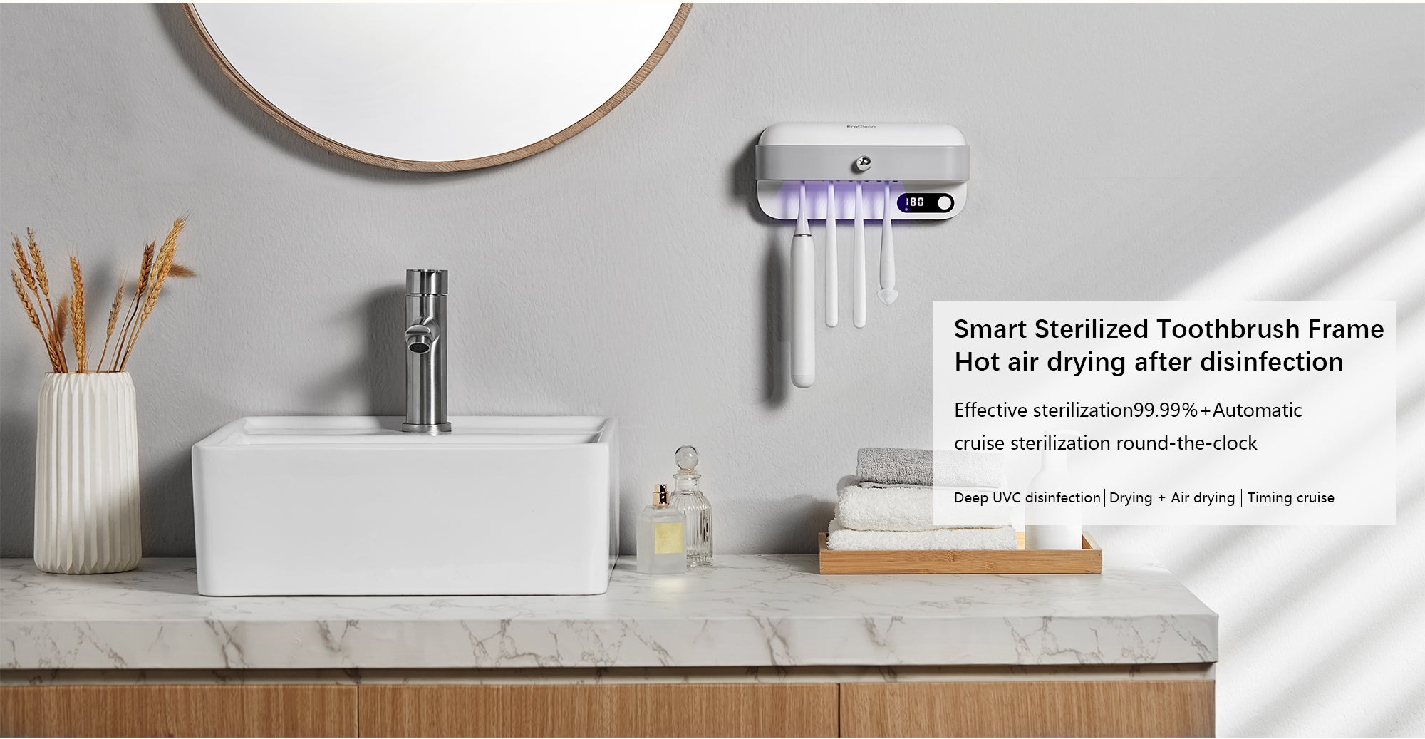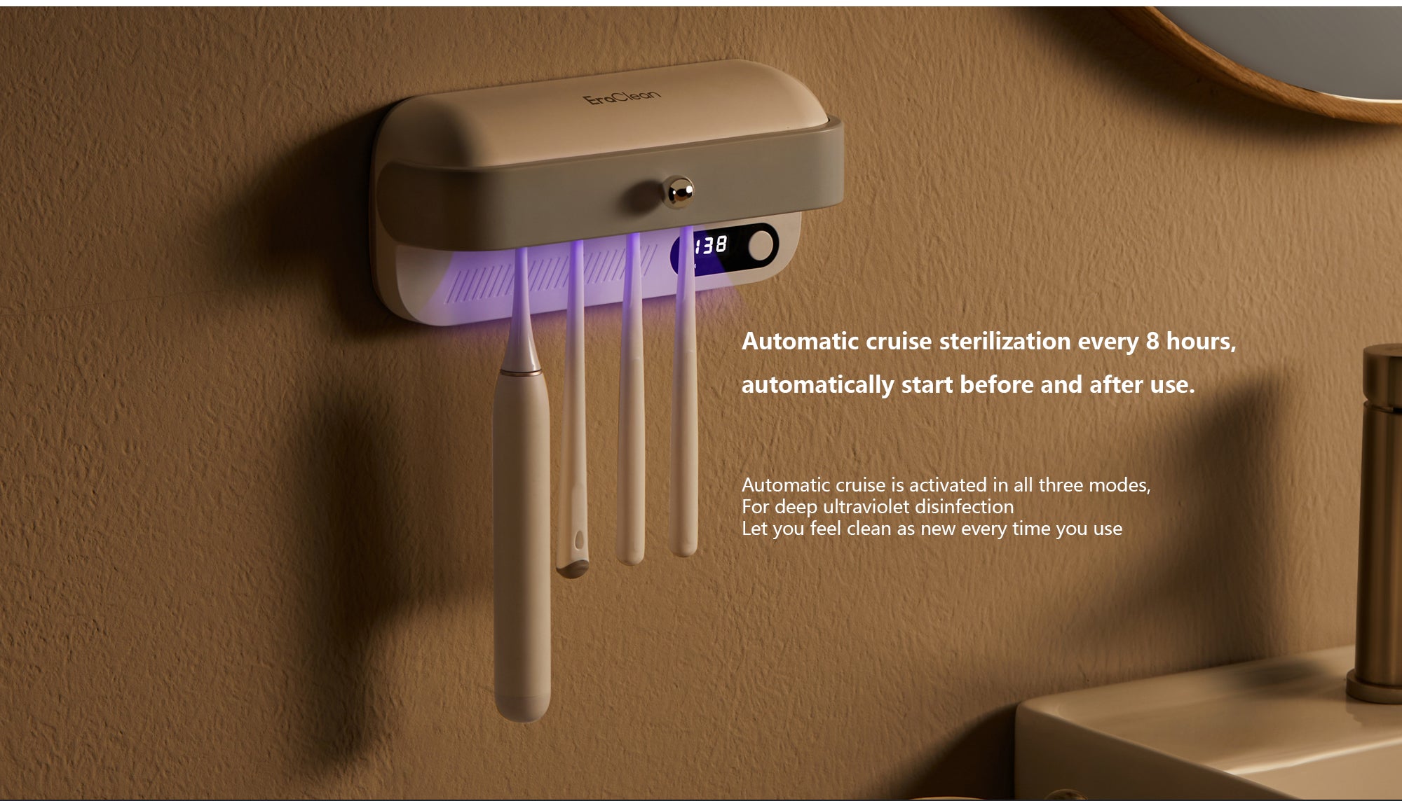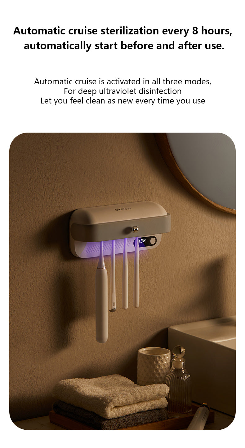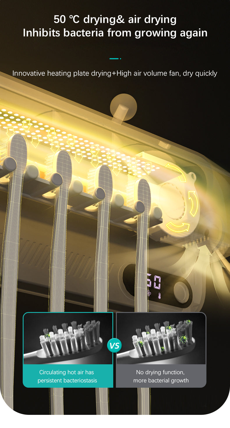 - The heating plate drying and high air volume fan also work together to dry your toothbrushes quickly after each use. Plus, the automatic cruise sterilization feature starts every 8 hours, so your toothbrushes are sterilized before and after each use, making them as clean as new every time.