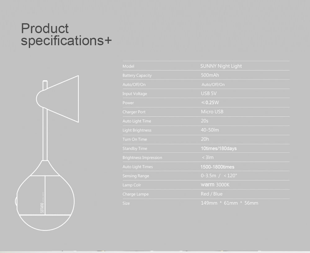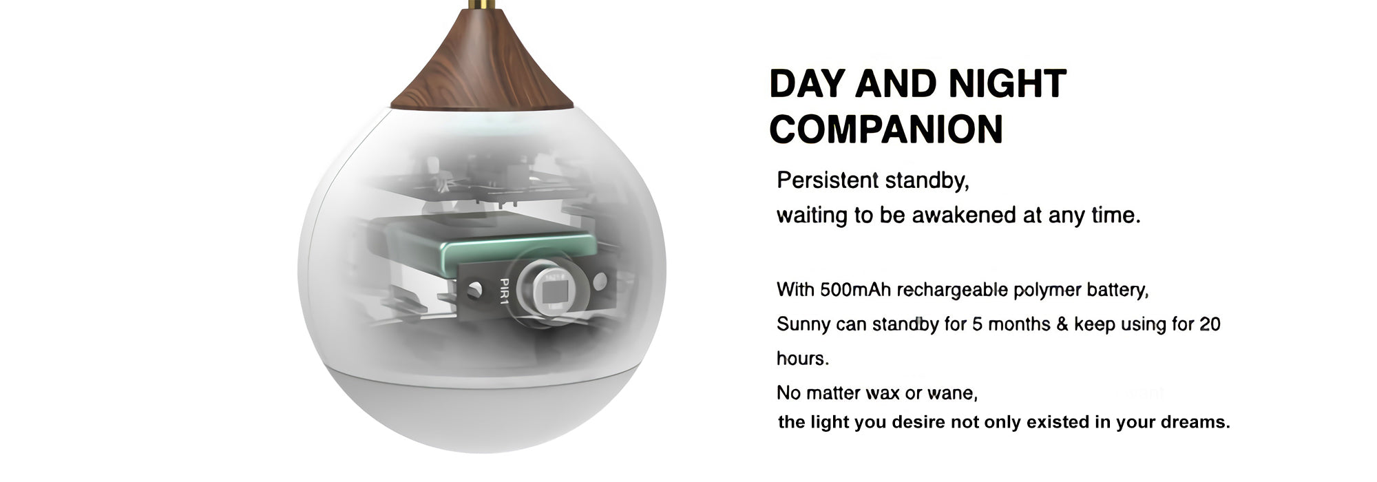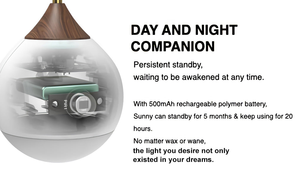 - The Sunny Night Light comes equipped with a 500mAh rechargeable polymer battery that provides up to 5 months of standby time and up to 20 hours of continuous use, making it a reliable and energy-efficient lighting solution. And with our FREE SHIPPING offer, now is the perfect time to upgrade your home lighting with Sunny Night Light!